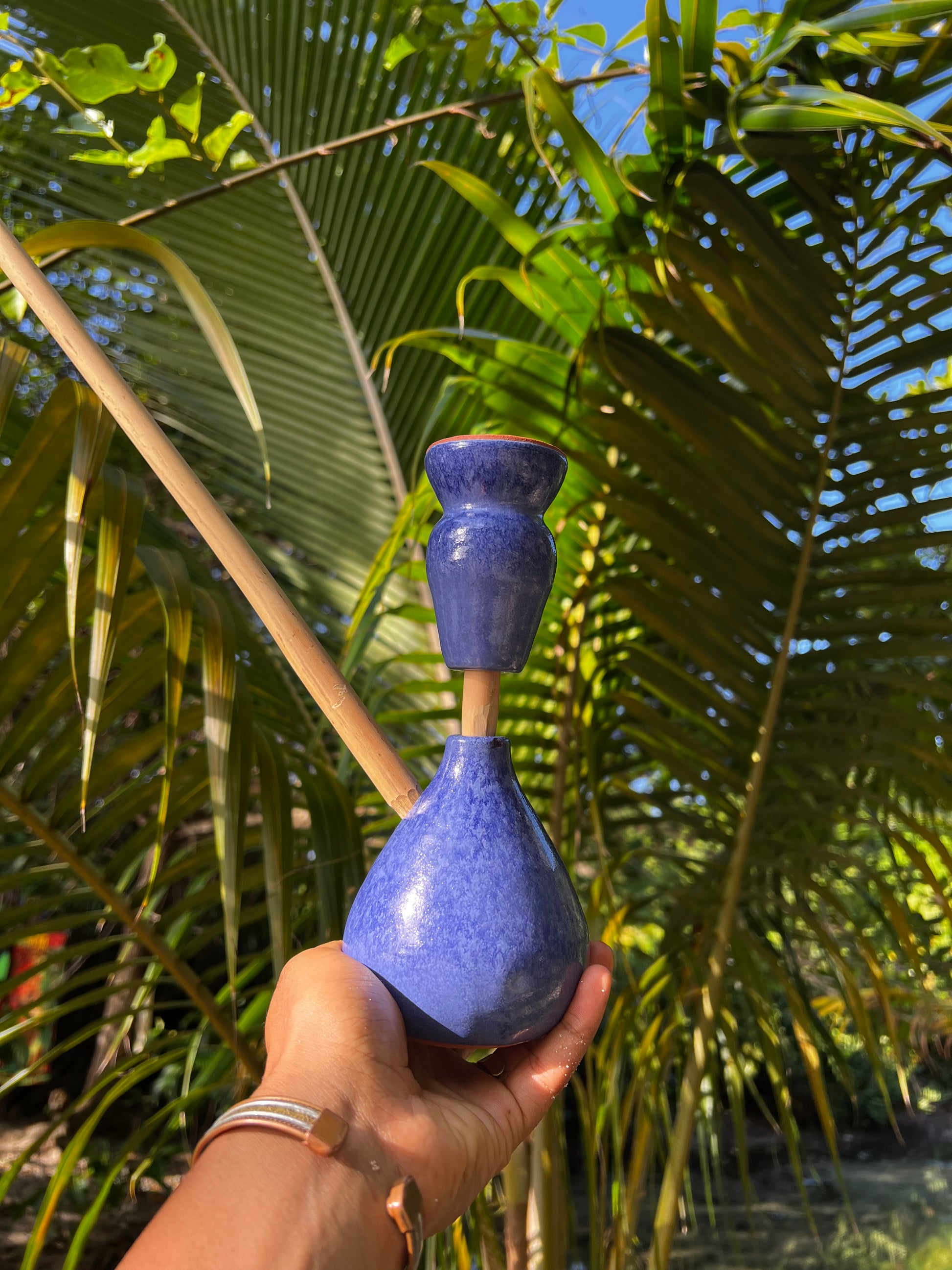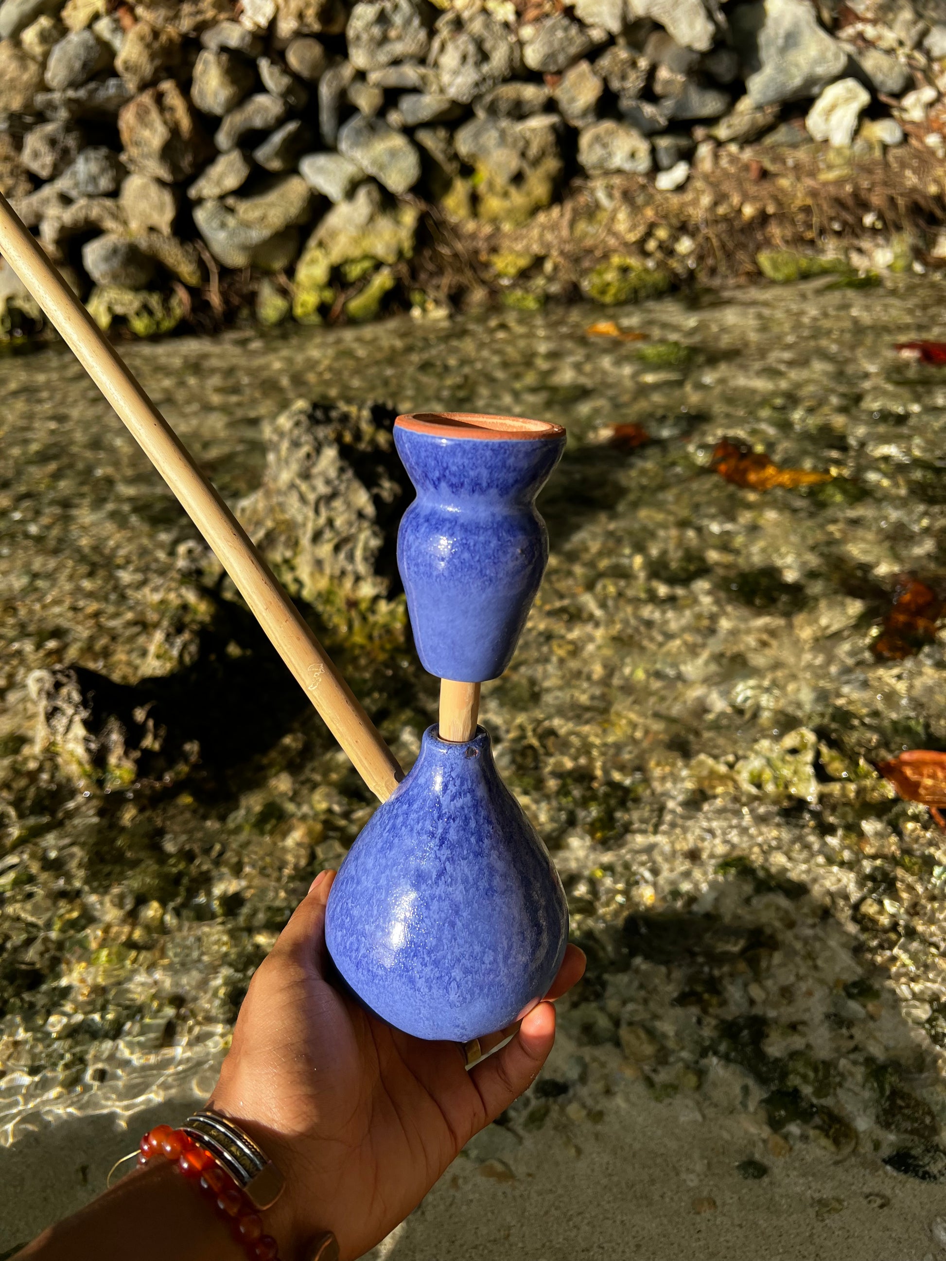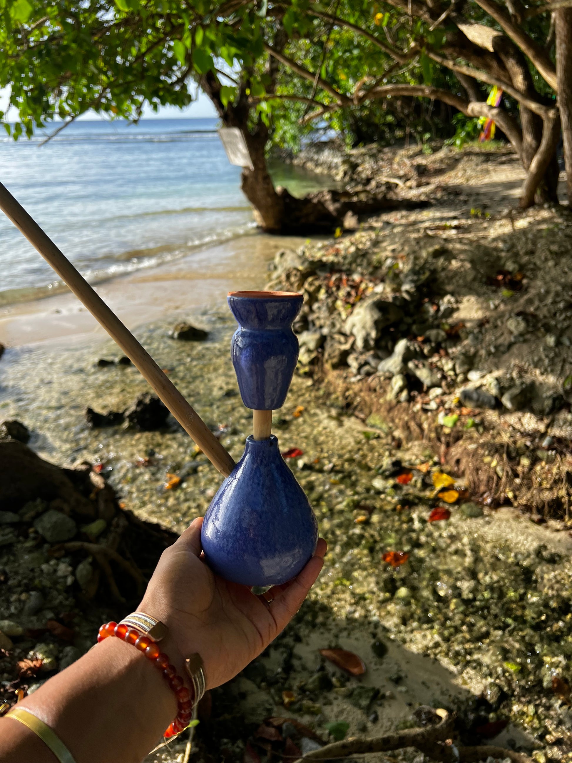 This Indigo Teardrop Steamaz carries the spirit of healing waters and ancient fire. Handcrafted with intention, its unique shape channels the breath in a gentle, womb-like flow. Deep indigo tones reflect mystic vibration, grounding you in livity and ancestral balance. A sacred vessel for personal ritual and natural purification.