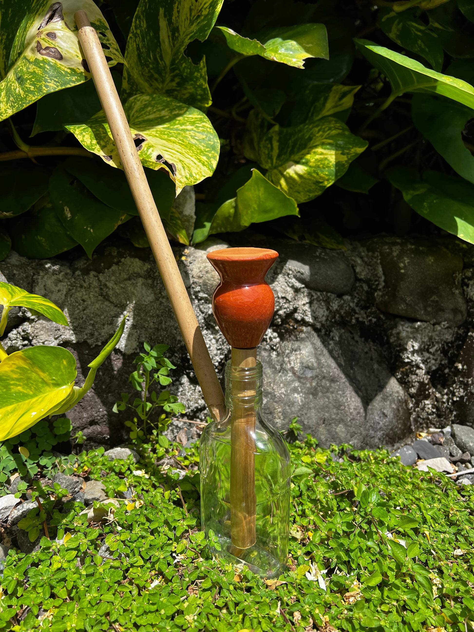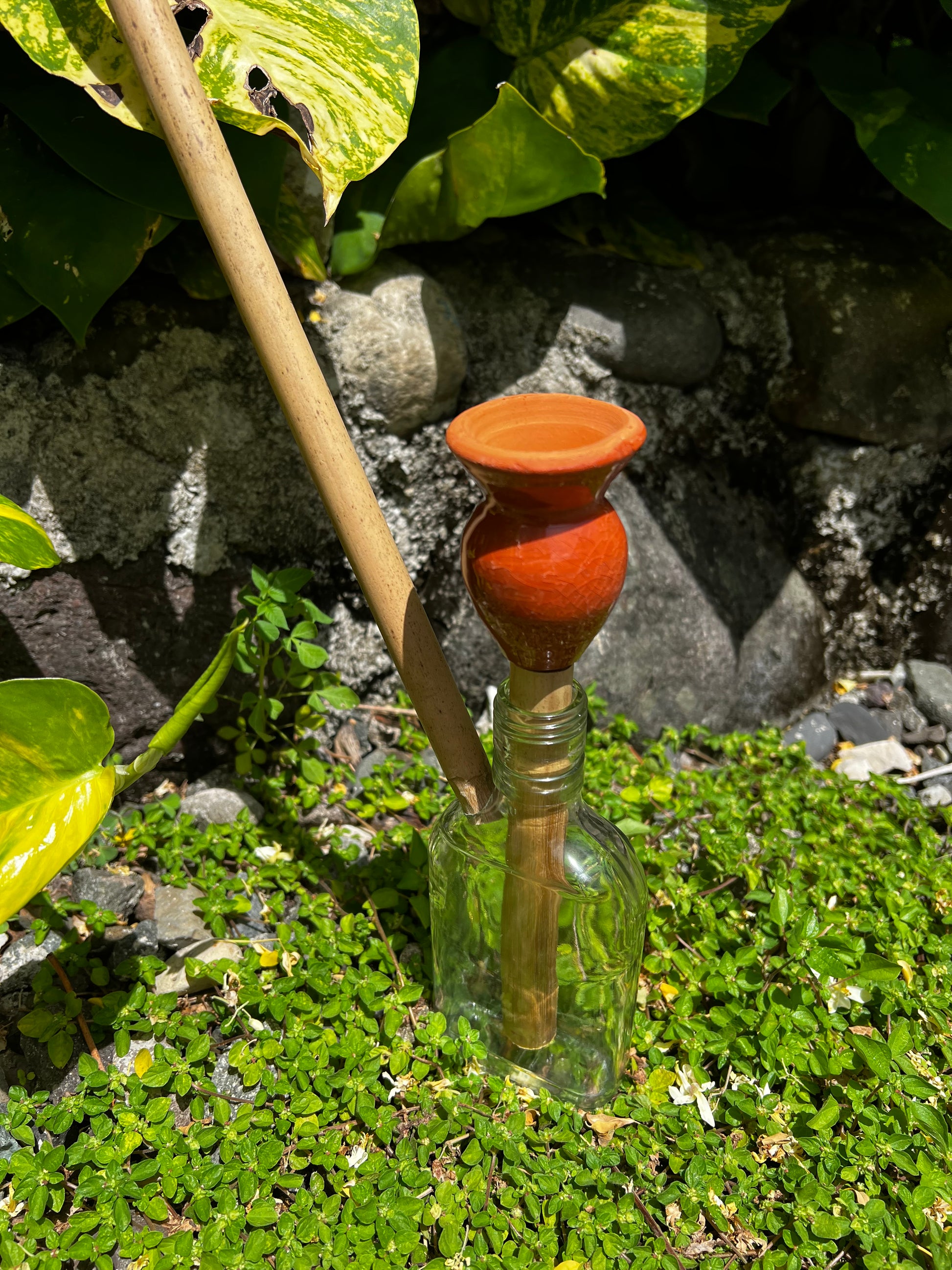 Made with recycled glass bottles from Jamaica. Limited Edition Thick Jamaican Glass is a classic piece made with all natural materials including, bamboo filtration system, mouth piece and 2 Jamaican clay kutchi and gritty’s. Both Kutchi will be clear glazed.