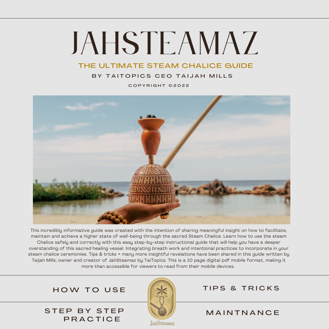 This incredibly informative guide was created with the intention of sharing meaningful insight on how to facilitate, maintain and achieve a higher state of well-being through the sacred Steam Chalice. Learn how to use the Steam Chalice safely and correctly with this easy step-by-step instructional guide that will help you have a deeper overstanding of this sacred healing vessel. Integrating breath work and intentional practices to incorporate in your steam chalice ceremonies. Tips & tricks + many more insightful revelations have been shared in this guide written by Taijah Mills; owner and creator of JahSteamaz by TaiTopics. This is a 10 page digital pdf mobile format, making it more than accessible for viewers to read from their mobile devices.
